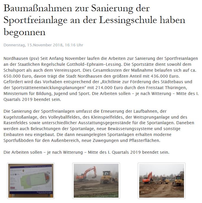 Seit Anfang November laufen die Arbeiten zur Sanierung der Sportfreianlagen an der Staatlichen Regelschule Gotthold-Ephraim-Lessing in Nordhausen.